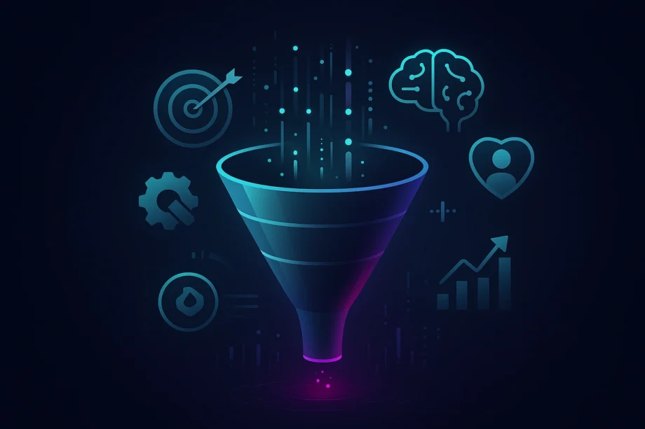 Dark-themed digital illustration of an AI-powered marketing funnel with data streams, glowing icons, and abstract analytics background Dark-themed digital illustration of an AI-powered marketing funnel with data streams, glowing icons, and abstract analytics background